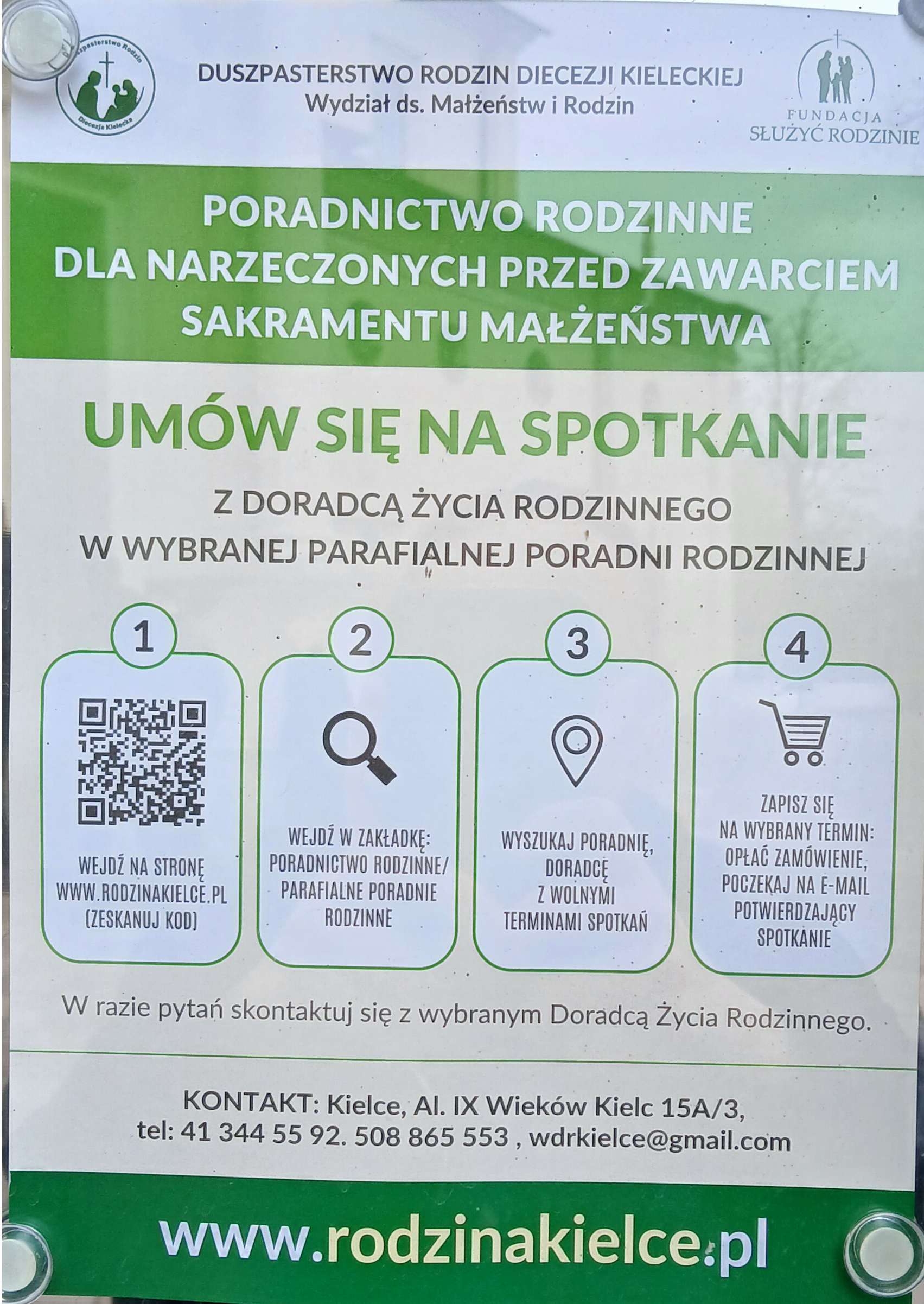 Spotkania PORADNI RODZINNEJ przy parafii św. Wojciecha w Kielcach odbywają się w salkach na wikariacie. Dzwonek na drzwiach wejściowych.